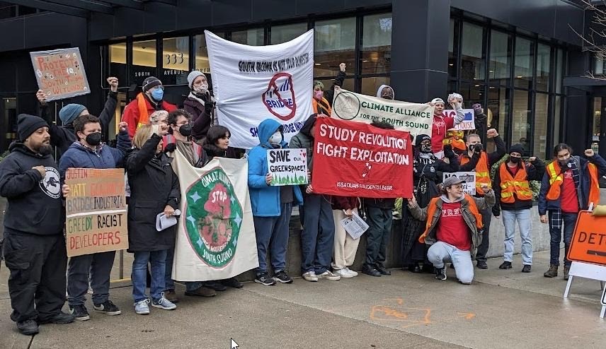 Bellevue, WA – On Friday, January 19, a crowd of about 30 people rallied near the Bridge Industrial office in Bellevue to protest the construction of a mega warehouse complex in South Tacoma.