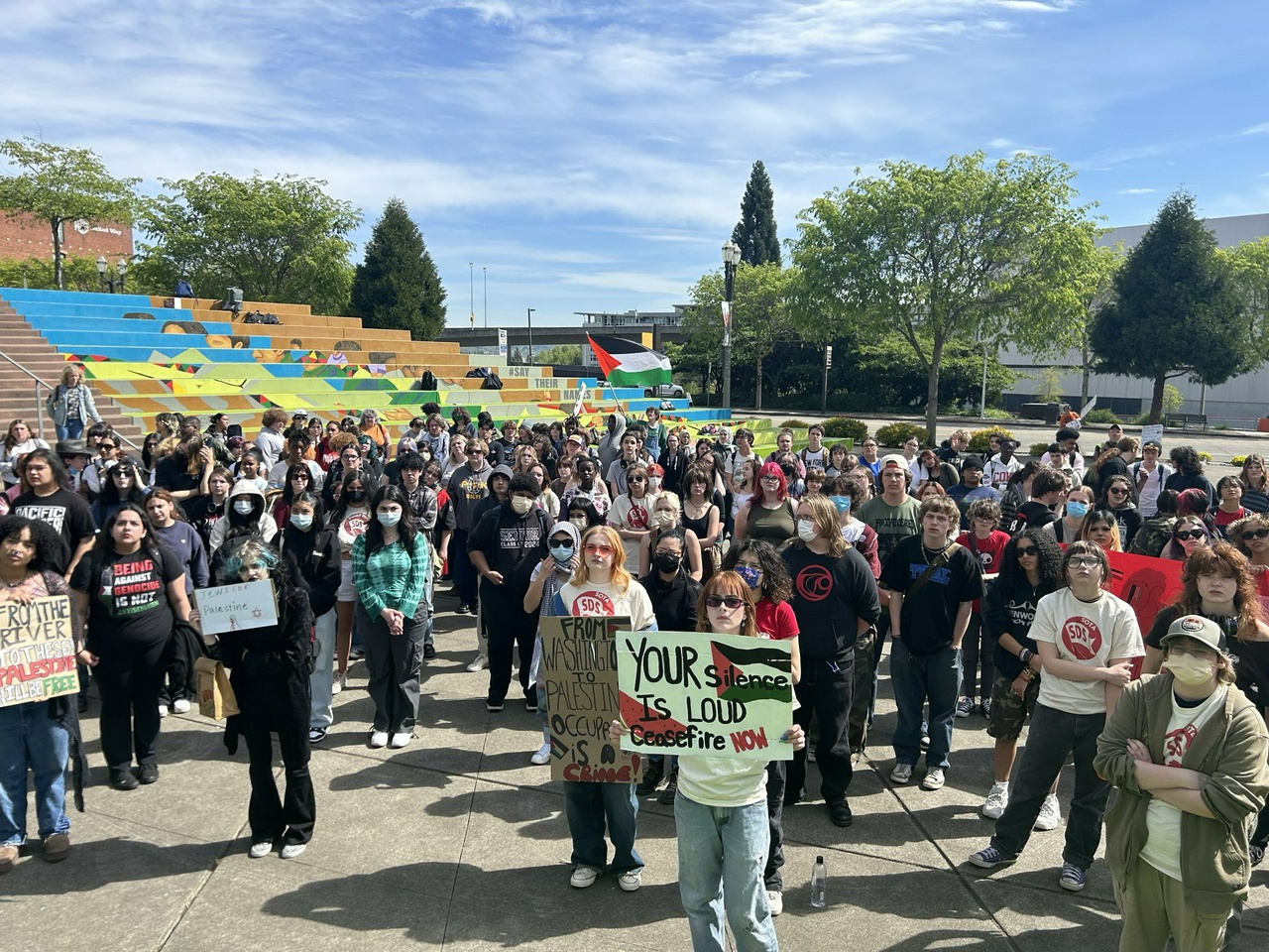 Tacoma WA – On Tuesday, April 23, over 150 students and faculty members from Tacoma School of the Arts, University of Washington Tacoma, and University of Puget Sound walked out of classes at 10:30 a.m. They rallied at Tollefson Plaza to demonstrate student solidarity with Palestine and demand that the United States of America divest from Israel.