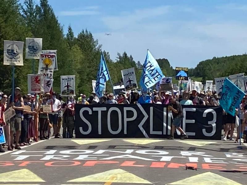 Coffee Pot Landing Bridge, MN – More than 2000 people protested at the Treaty People Gathering on June 7 at Coffee Pot Landing, a metal bridge over the Mississippi River, near Itasca State Park and the headwaters of the Mississippi River. The protest was a part of a three day event to build public pressure to stop the construction of Enbridge Energy’s Line 3 pipeline. The pipeline expansion will bring nearly a million barrels of tar sands oil per day from Alberta, Canada to Superior, Wisconsin.