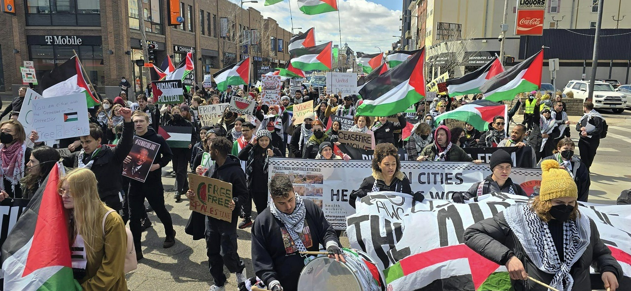 Minneapolis, MN – On April 20, on a brisk spring afternoon, over 350 pro-Palestine demonstrators rallied at Bryant Square Park in the Minneapolis Uptown neighborhood for the first large scale march initiated by the Minnesota chapter of Students for Justice in Palestine and the Arab Student Association at the U of MN.
